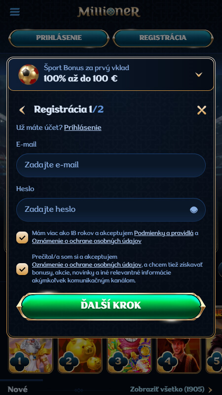 Prejdite na oficiálnu stránku millioner2.com/sk a kliknite na „Registrácia“ v pravom hornom rohu.