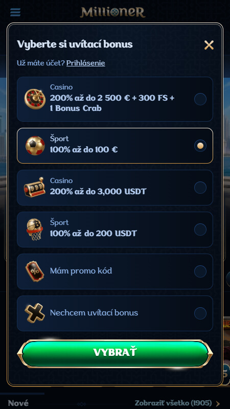 Vyberte si športový bonus z ponuky, ktorá sa zobrazí – dostupné sú varianty vo fiat mene aj v kryptomenách.